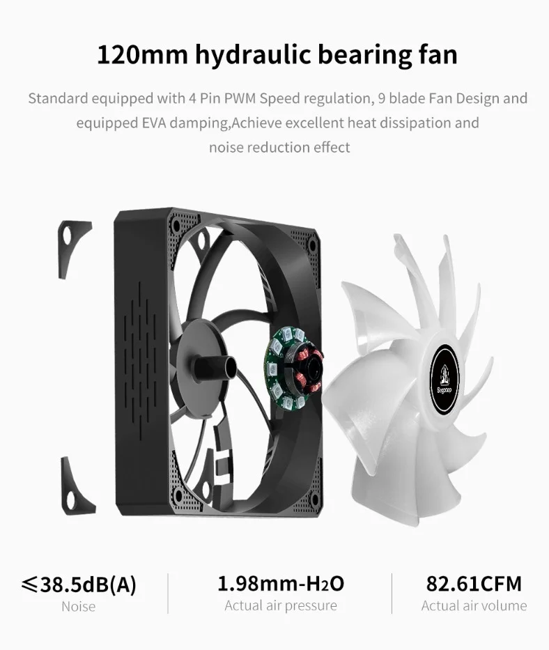 Standart olarak 4 Pin PWM hız ayarı, 9 kanatlı fan tasarımı ve donanımlı EVA sönümleme ile donatılmıştır, Mükemmel ısı dağılımı ve gürültü azaltma etkisi sağlar.