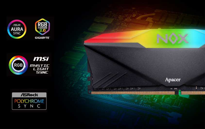 Desteklenen ASUS AURA sync, GIGABYTE RGB Fusion 2.0, MSI Mystic Light Sync ve ASRock Polychrome Sync yazılımları ile Apacer Nox RGB’nin aydınlatma renk ve efektlerini kişiliğinizi yansıtacak şekilde özelleştirip diğer sistem bileşenlerinizle senkronize hale getirin. Bırakın sisteminiz ışıldasın!