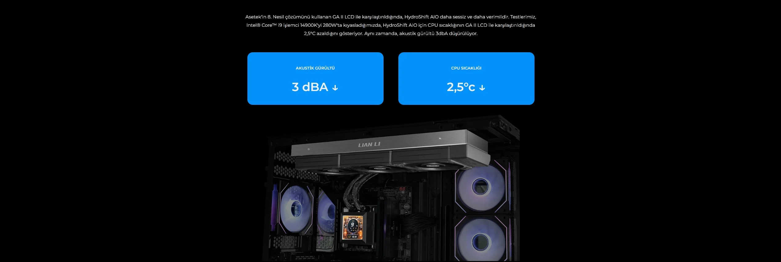 Asetek'in 8. Nesil çözümünü kullanan GA II LCD ile karşılaştırıldığında, HydroShift AIO daha sessiz ve daha verimlidir. Testlerimiz, Intel® Core™ i9 işlemci 14900K'yi 280W'ta kıyasladığımızda, HydroShift AIO için CPU sıcaklığının GA II LCD ile karşılaştırıldığında 2,5°C azaldığını gösteriyor. Aynı zamanda, akustik gürültü 3dbA düşürülüyor.