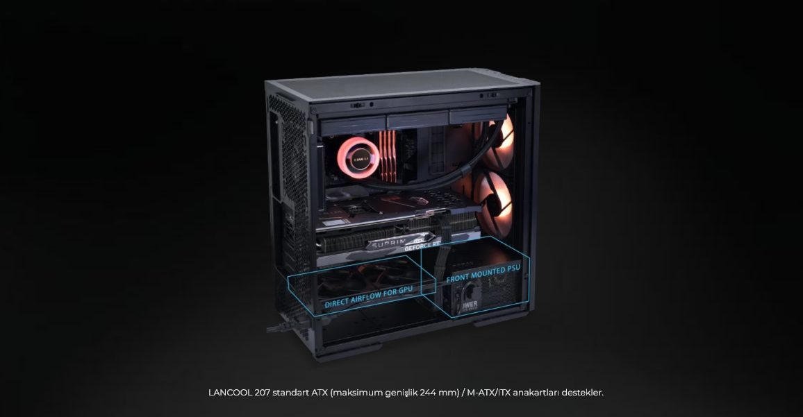 LANCOOL 207, üst, ön ve yan alt kısımlarda kapsamlı örgü panellerle tasarlanmış olmasının yanı sıra, üstün kullanıma hazır soğutma için dört adet yüksek performanslı fanla önceden monte edilmiş olarak gelir.
