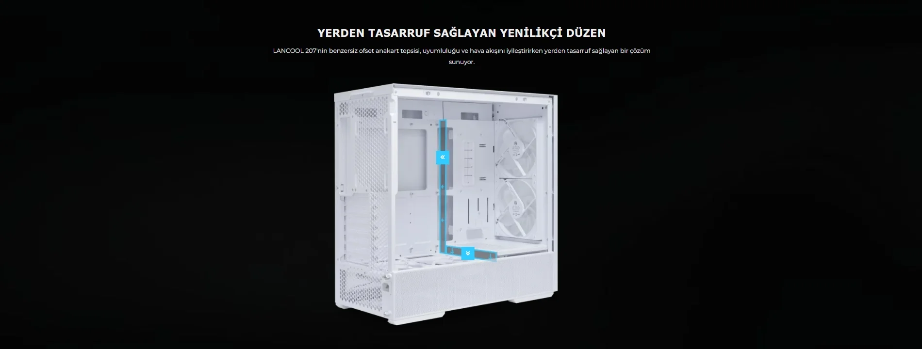 LANCOOL 207'nin benzersiz ofset anakart tepsisi, uyumluluğu ve hava akışını iyileştirirken yerden tasarruf sağlayan bir çözüm sunuyor.