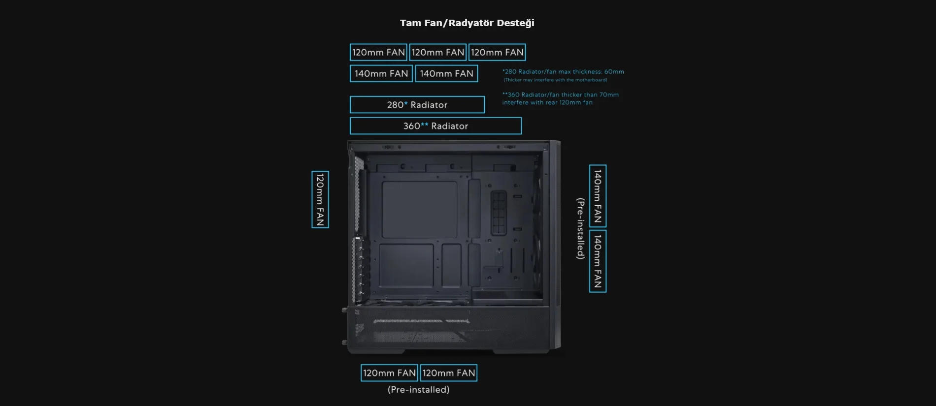 Fan Desteği Ön: 140mm x 2 - Üst: 120mm x 3 veya 140mm x 2 - PSU Kılıfının Üstü: 120mm x 2 - Arka: 120mm x 1